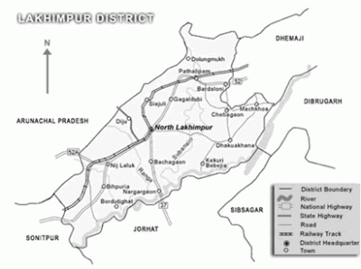Lakhimpur is an administrative district in the state of Assam in India. The district headquarters are located at North Lakhimpur. The district occupies an area of 2277 sq. km. and has a population of 10,40644 (as of 2011 Census). The name Lakhimpur is believed to be originated from the word "Lakshmi”" the goddess of prosperity. The district is mainly dependent upon agriculture and paddy. Paddy is regarded locally as "Lakhimi". The word "pur" means "full". Lakhimpur therefore means full of paddy or the place where paddies are grown abundantly. Besides, the soil of the district is alluvial and fertile for which crops flourish without use of any artificial manure or hard labour. Over and above fish, meat, vegetables, milk were abundant in this district. Others say that the word originated from Lakhsmi Devi, the mother of Bhuyan Raja who was the descendent of King Arimatta . As per Lakhimpur District Gazette (1976:4) , the district was notified as Lakhimpur District through a proclamation issued by then Governor General on July, 1839. On 2nd October, 1971 the district was reorganized with two sub divisions viz. Dhemaji and North Lakhimpur . Later it was again reorganized in the year 1980 with two subdivisions viz. Dhakuakhana and North Lakhimpur leaving Dhemaji as a separate district. It is bounded on the north by Siang and Papumpare District of Arunachal Pradesh and on the east by Dhemaji District and Subansiri river. Majuli Sub Division of Jorhat District stands on the southern side and Gahpur sub division of Sonitpur District is on the West. Lakhimpur is also the gateway to several districts of Arunachal Pradesh including Itanagar.